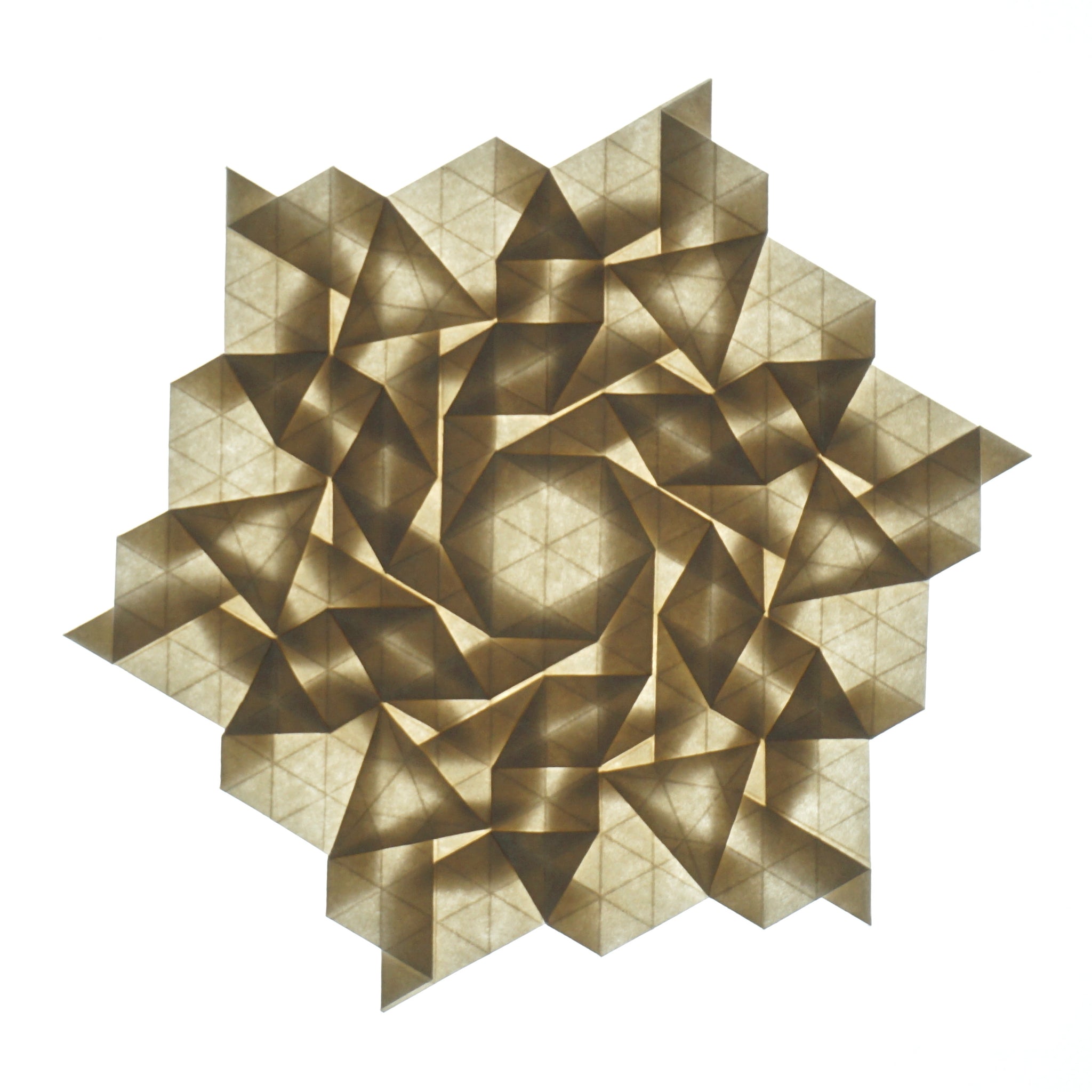 These hexagons are the same size as the ones cut with the Small Hexagon Template, and I'd recommend using this size to fold 16 or 24 division grids for beginners, and up to 48 grid divisions for advanced origami tessellation folders.